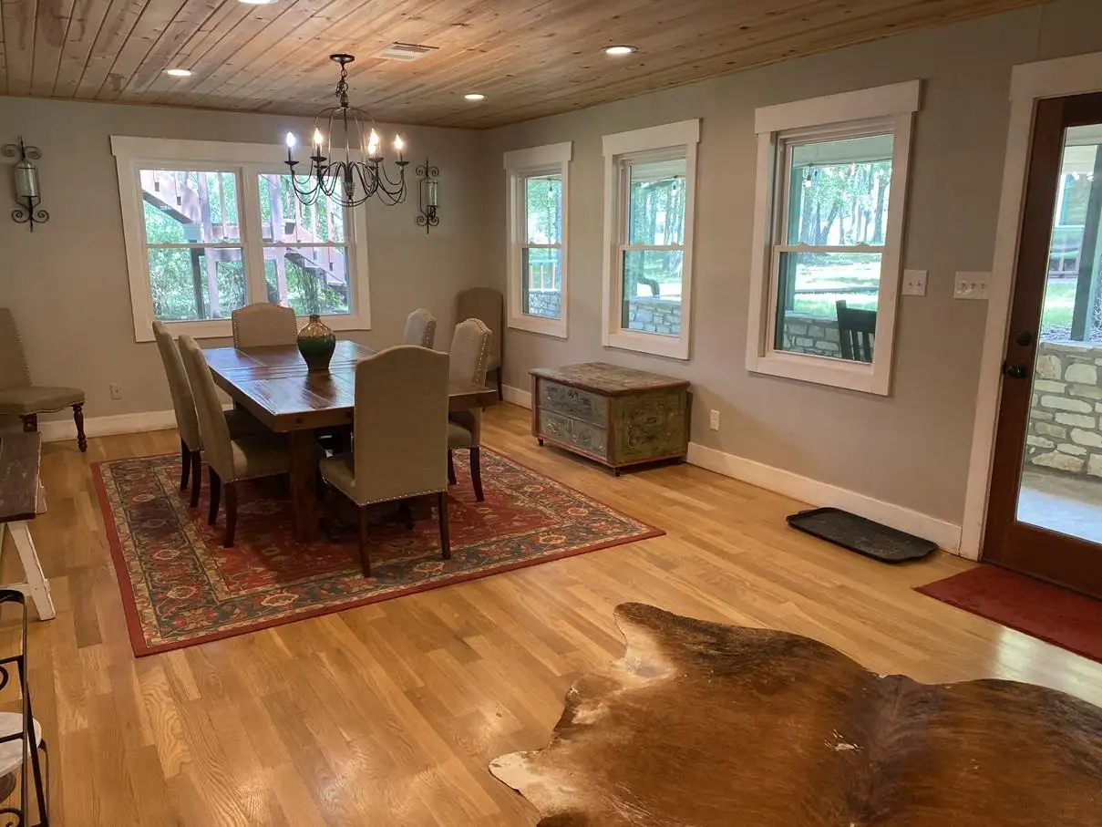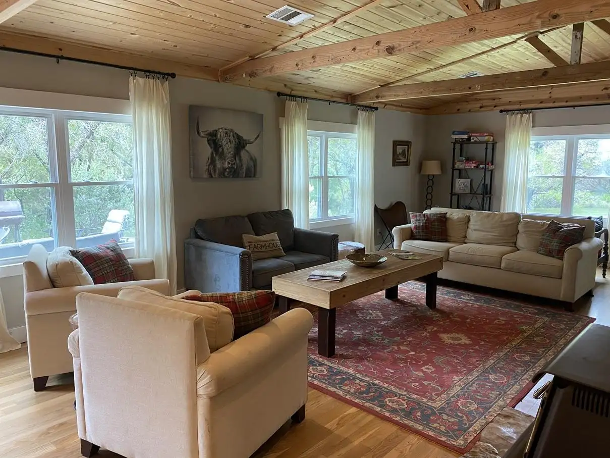 Escape to the peaceful countryside at Creekside Farmhouse, a charming retreat nestled on over 2.5 acres of scenic Texas Hill Country. Just a short 10-minute drive from the heart of downtown Wimberley, this spacious 2,500-square-foot home offers the perfect blend of privacy, comfort, and convenience.