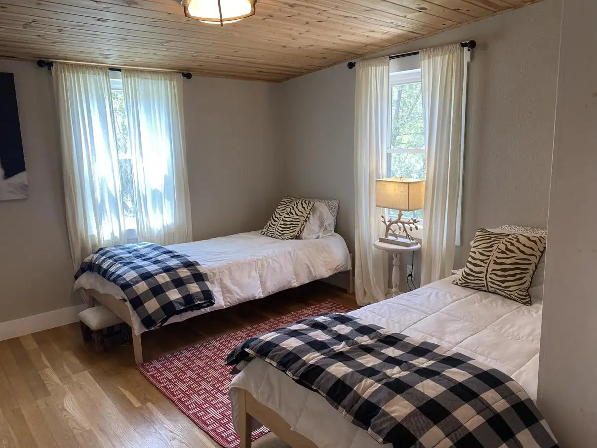 Downstairs: One king bedroom with a private bath, plus a cozy second bedroom with two twin beds and a full bath.